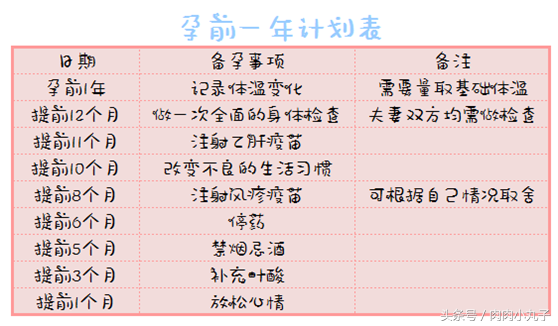下面是我整理的孕前一年的计划表: