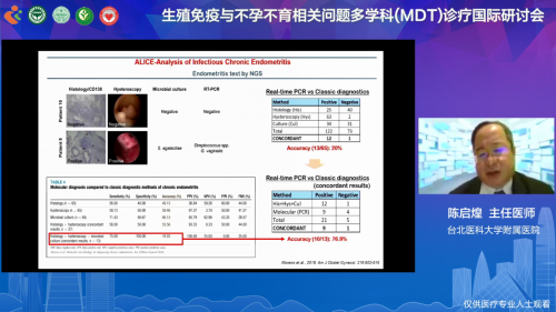 台北医学大学附属医院生殖医学科主任陈启煌教授讲述了《子宫内膜健康的新维度之探讨》,陈教授对反复性着床失败风险因子、子宫内膜容受性的机理及测定进行了讲解,并结合临床案例对潜在的解决反复性着床失败的方案进行前瞻性的分享。
