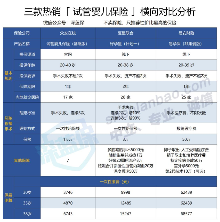 通过全网搜索,深蓝君找到3款试管婴儿保险,并选取了比较有代表性的版本: