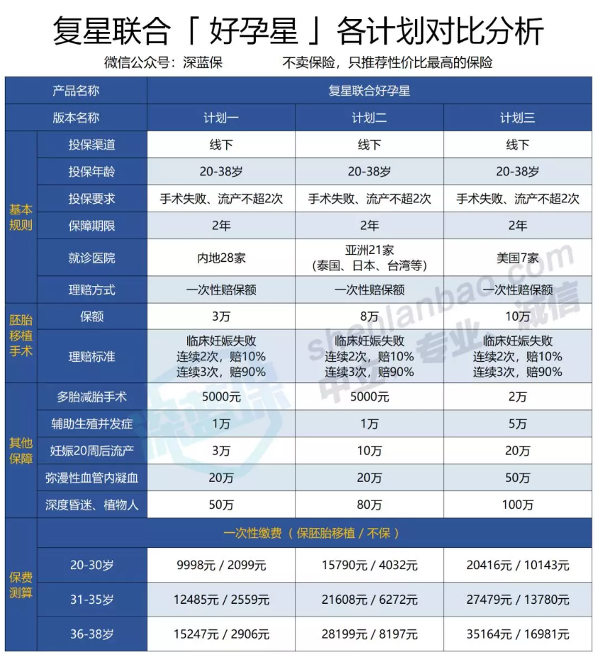 如果看重全面保障:复星好孕星是保障两年的,手术失败两次就开始赔付,还保减胎、流产、并发症等;如果想去亚洲、美国等地做手术,也有相应的计划可选。