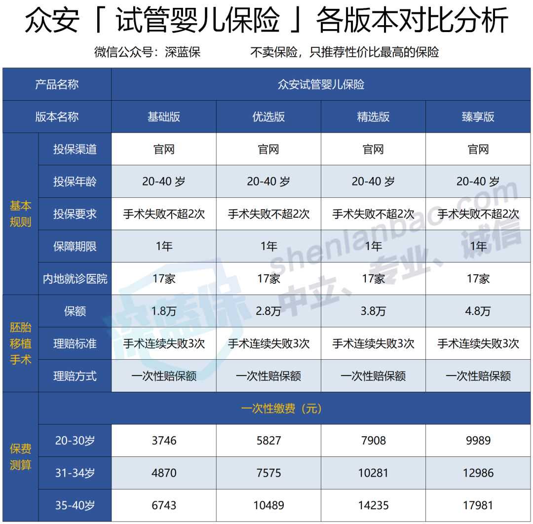 如果预算不高:众安试管婴儿保险的基础版,30岁保费3700元,如果手术连续失败3次,就一次性赔1.8万。虽然理赔门槛较高,但多少能弥补一些费用。