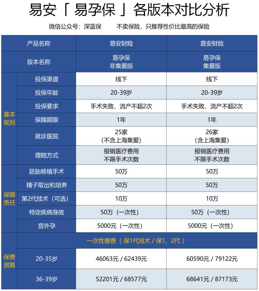 如果预算充足:易安易孕保的保额有50万,一年内不限次数报销,但是保费也要贵不少。不过这款产品不保第3代试管婴儿技术。
