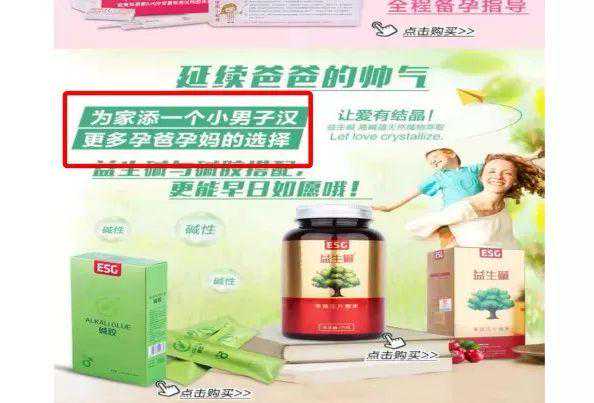 进入一些网店可以发现,不少商家使用“为家添一个小男子汉”“活泼男宝更爱碱性妈妈”等宣传语,暗示产品可调节身体酸碱度对生育“人工干预”。