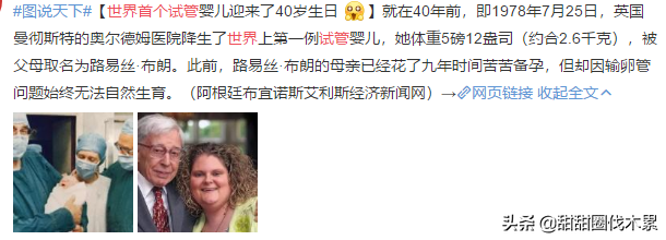 世界首例试管婴儿路易丝·布朗,1978年7月25日出生,去年刚刚举办了40周年的纪念展,本人看起来一切健康,2006年通过自然怀孕生下一个男孩。