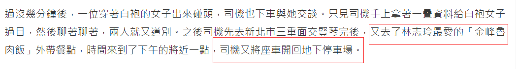 与医生聊完之后,这位司机去到一家店买了饭,又把车开回了最初的停车场,似乎是去与林志玲会和。